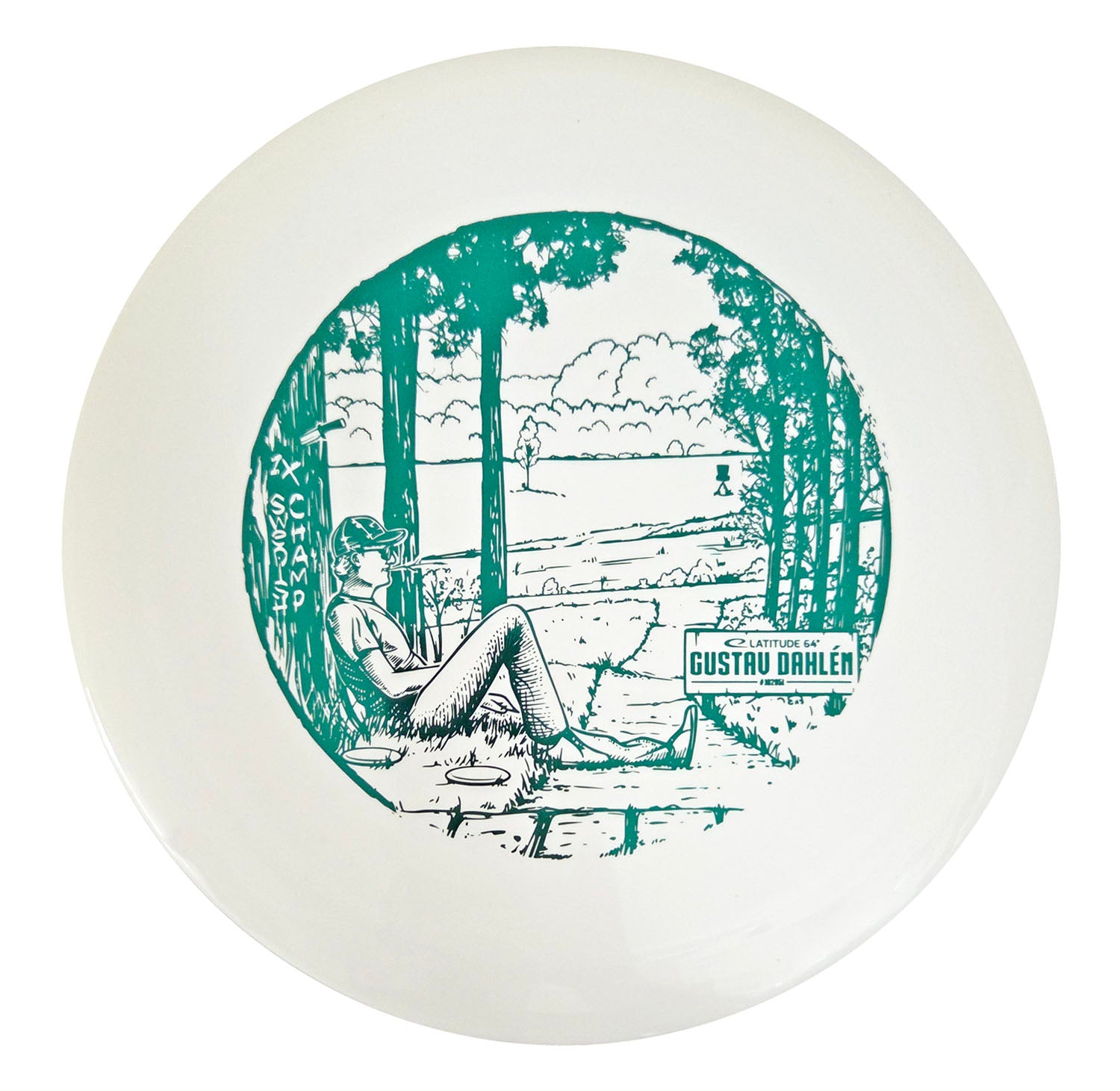 En unik upplaga av discar för att fira Gustav Dahléns vinst av SM 2025 på Västerhaninge. I designen ser ni Gustav sittande vid hål 8 på Västerhaninge DGB. Alla inkomster från försäljningarna av discarna går till Gustav Dahlén.