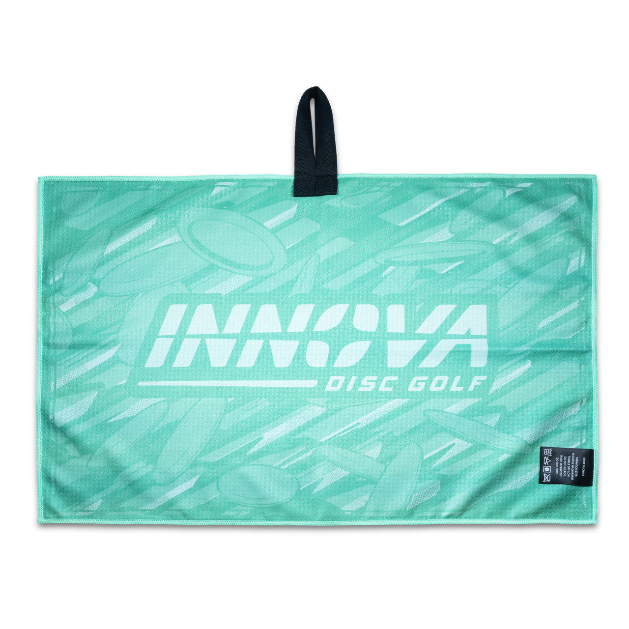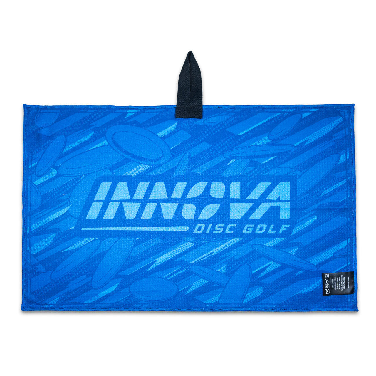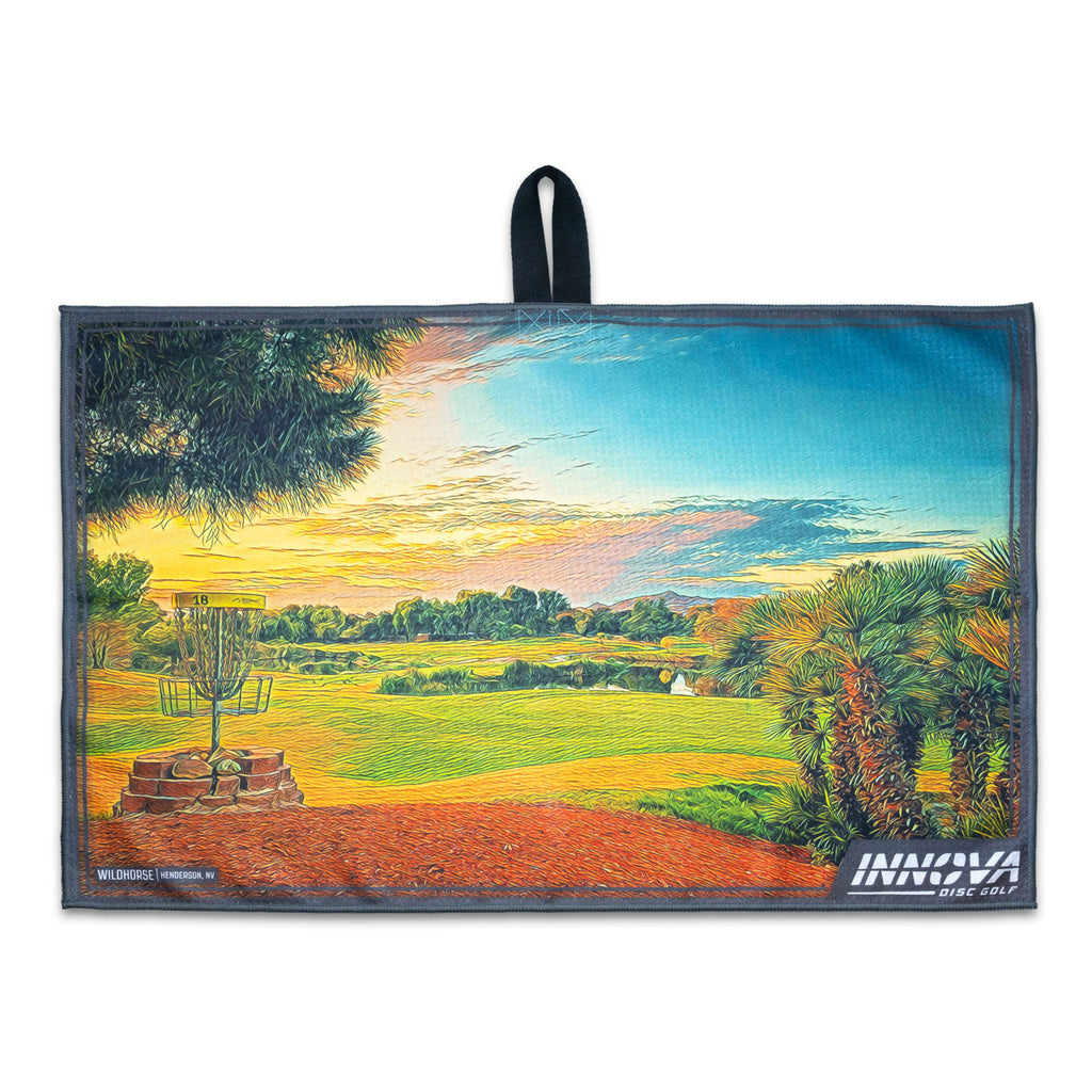 Colorful, big, absorbent. The Tour Towels are made from 100% waffle weave polyester with a high resolution color print on both sides. There are seven new designs for 2025, and each has the Innova Logo with discs on the reverse side. The fabric loop in the center of the towel makes for easy attachment. Towel Measurements: 63,5 cm X 43,2 cm